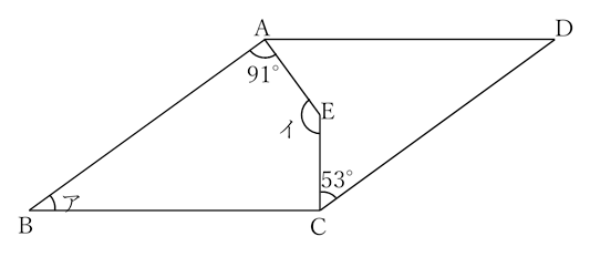 ひし形ABCDの対角線上に点Eをとったところ,角BAE=91° 角ECD=53°となりました。このとき,ア,イの角度はそれぞれ何度ですか。