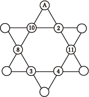 下の図は1から12までの数をそれぞれ1回ずつ使って,一直線上にならんだ4つの数をたした数がいっしょになるようにしたものです。Aにあてはまる数はいくつですか。