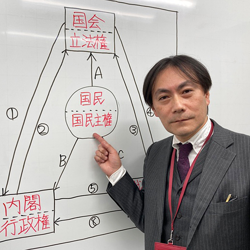 社会は単なる暗記科目ではないというスタンスで、理屈や背景知識を交えた授業展開に強いこだわりを持つ。授業を受けた生徒からは、「より興味が深まった」「社会が好きになった」との声が多数。一人でも多くの生徒を社会好きにするべく、生徒と正面から粘り強く向き合っている。