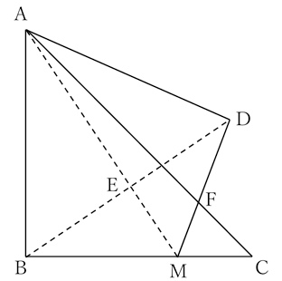 図の三角形ABCは直角二等辺三角形で,AB,BCの長さは10cmです。BM:MC=2:1となる点をMとして,三角形ABMをAMで折り返してできる三角形がADMです。AMとBDの交点をE,ACとMDの交点をFとします。 MFの長さはFDの長さの何倍ですか。